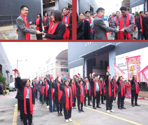 随着一阵急促的锣鼓声响起,醒狮表演震撼登场。数只雄狮欢腾起舞,它们时而摇头摆尾,憨态可掬;时而腾空跃起,威武勇猛,瞬间点燃了现场的气氛。严总、梁总等一众高管为沉睡的祥狮点下神圣的一笔,寓意着“点醒雄狮,招财纳福”。随后醒狮采青,寓意“财源滚滚、好运连连”。接着,醒狮旺场,把瑞祥之气带到全厂的每一角落。鞭炮一响,黄金万两,漫长又响亮的鞭炮声把开工仪式推向高潮。
